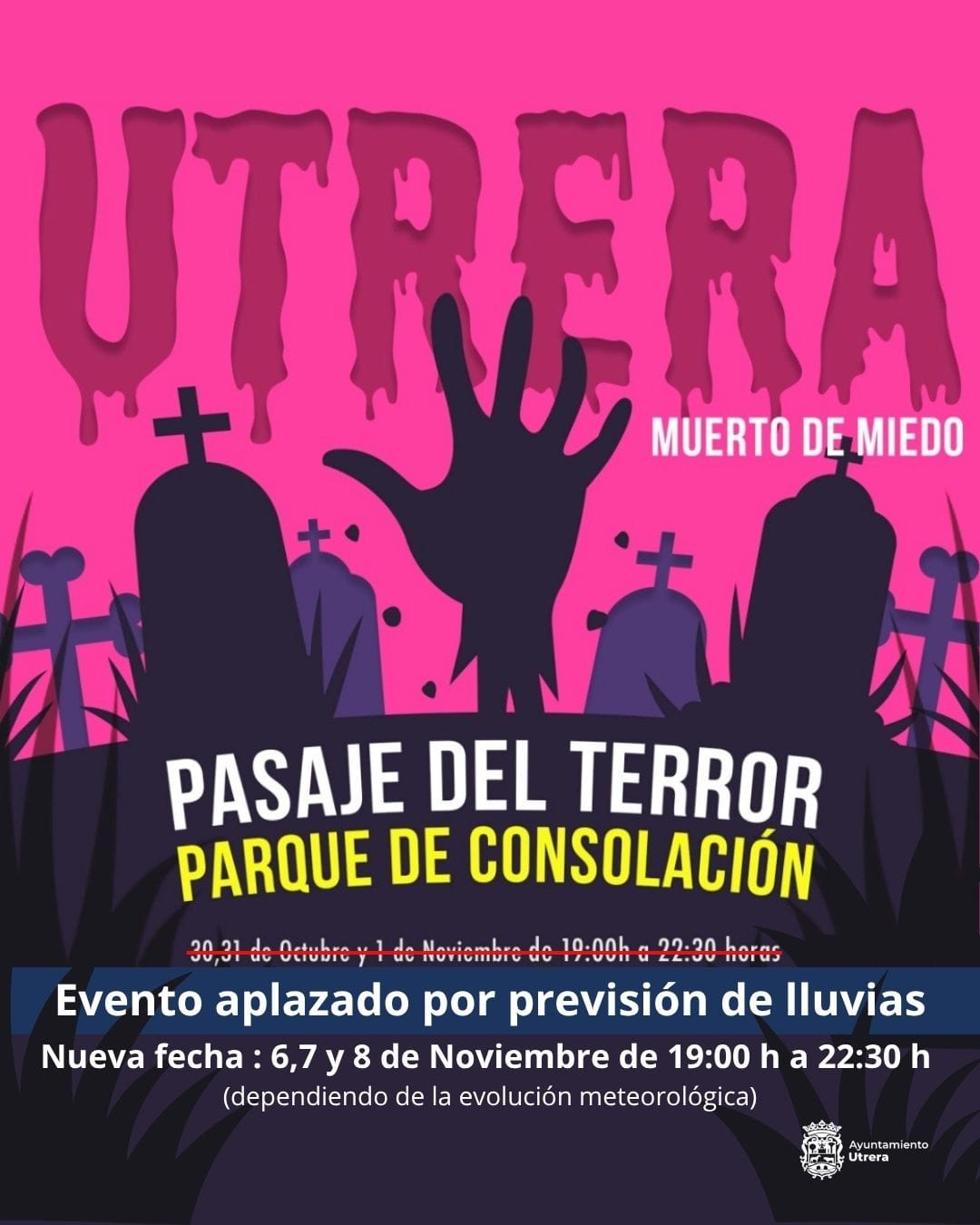 La Delegación de Juventud del Ayuntamiento de Utrera informa del aplazamiento del “Pasaje del Terror”, previsto para los días 30 y 31 de octubre y 1 de noviembre en el Parque de Consolación, debido a la previsión de lluvias para esas fechas.